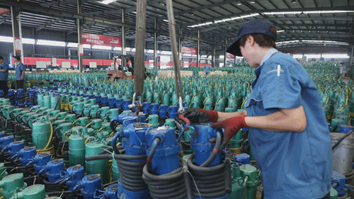 經(jīng)過(guò)工人們1個(gè)多小時(shí)的精心調(diào)試, 80臺(tái)小型潛水泵被迅速裝上車。